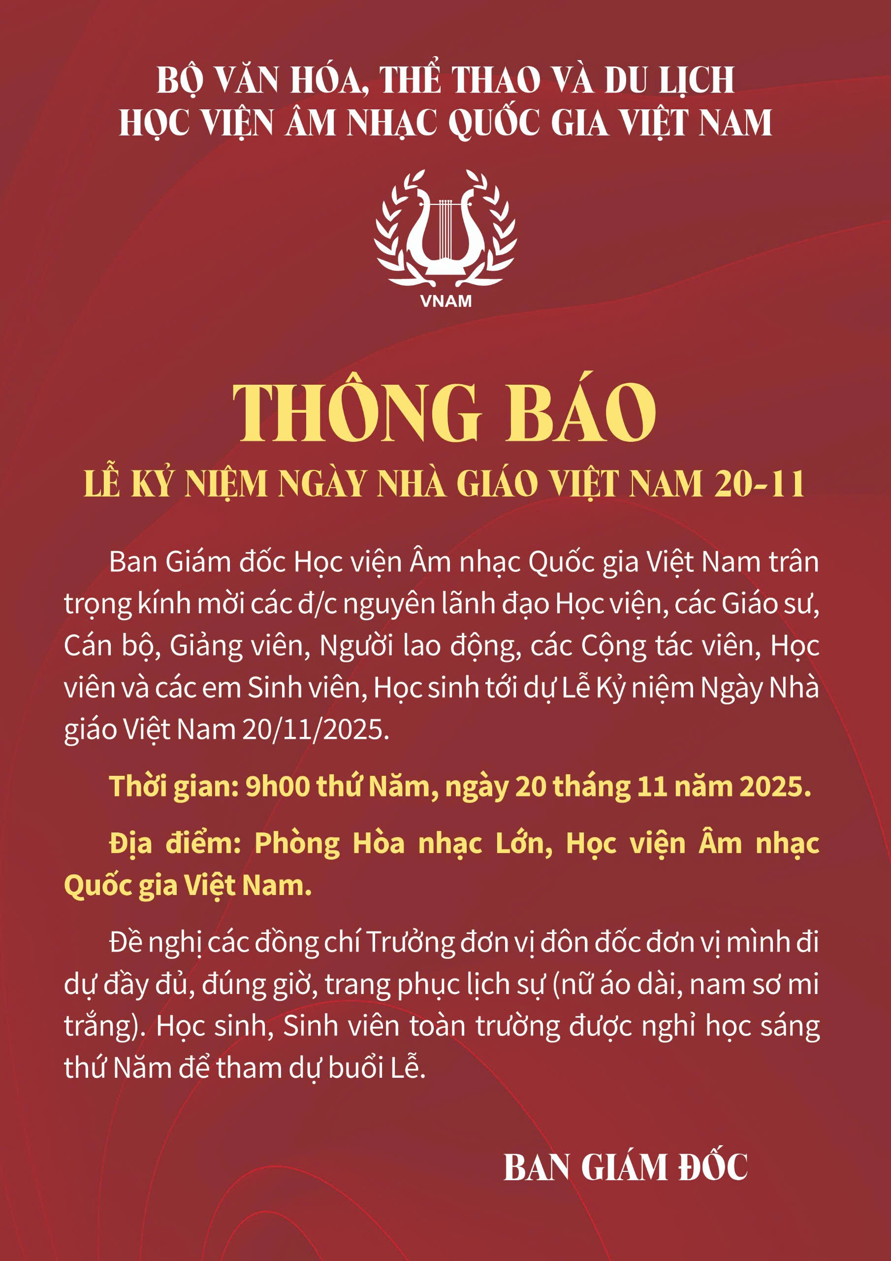 Căn cứ Văn bản hợp nhất Luật Giáo dục đại học số 42/VBHN-VPQH ngày 10/12/2018 của Văn phòng Quốc hội; Căn cứ Quyết định số 37/2018/QĐ-TTg ngày 31/8/2018 của Thủ tướng Chính phủ quy định tiêu chuẩn, thủ tục xét công nhận đạt tiêu chuẩn và bổ nhiệm chức danh giáo sư, phó giáo sư; Căn cứ Quyết định số79/QĐ-HĐGSNN ngày 19/11/2025 của Hội đồng Giáo sư Nhà nước về việc công nhận đạt chuẩn chức danh giáo sư, phó giáo sư; Căn cứ chiến lược phát triển và định hướng thu hút nguồn nhân lực chất lượng cao tại đơn vị, Học viện Âm nhạc Quốc gia Việt Nam thông báo nhu cầu và điều kiện xét bổ nhiệm chức danh phó giáo sư năm 2025, nội dung cụ thể như sau...