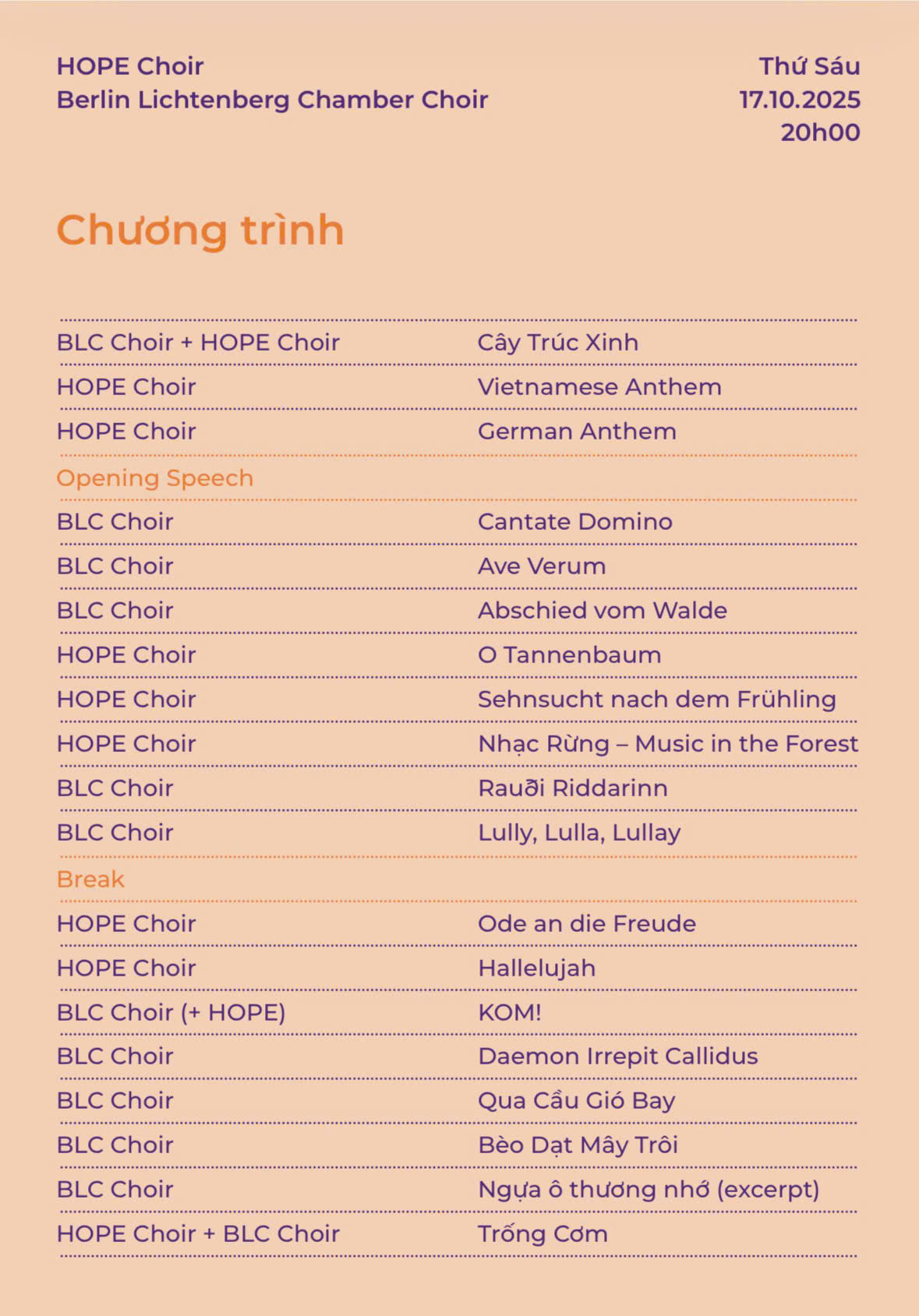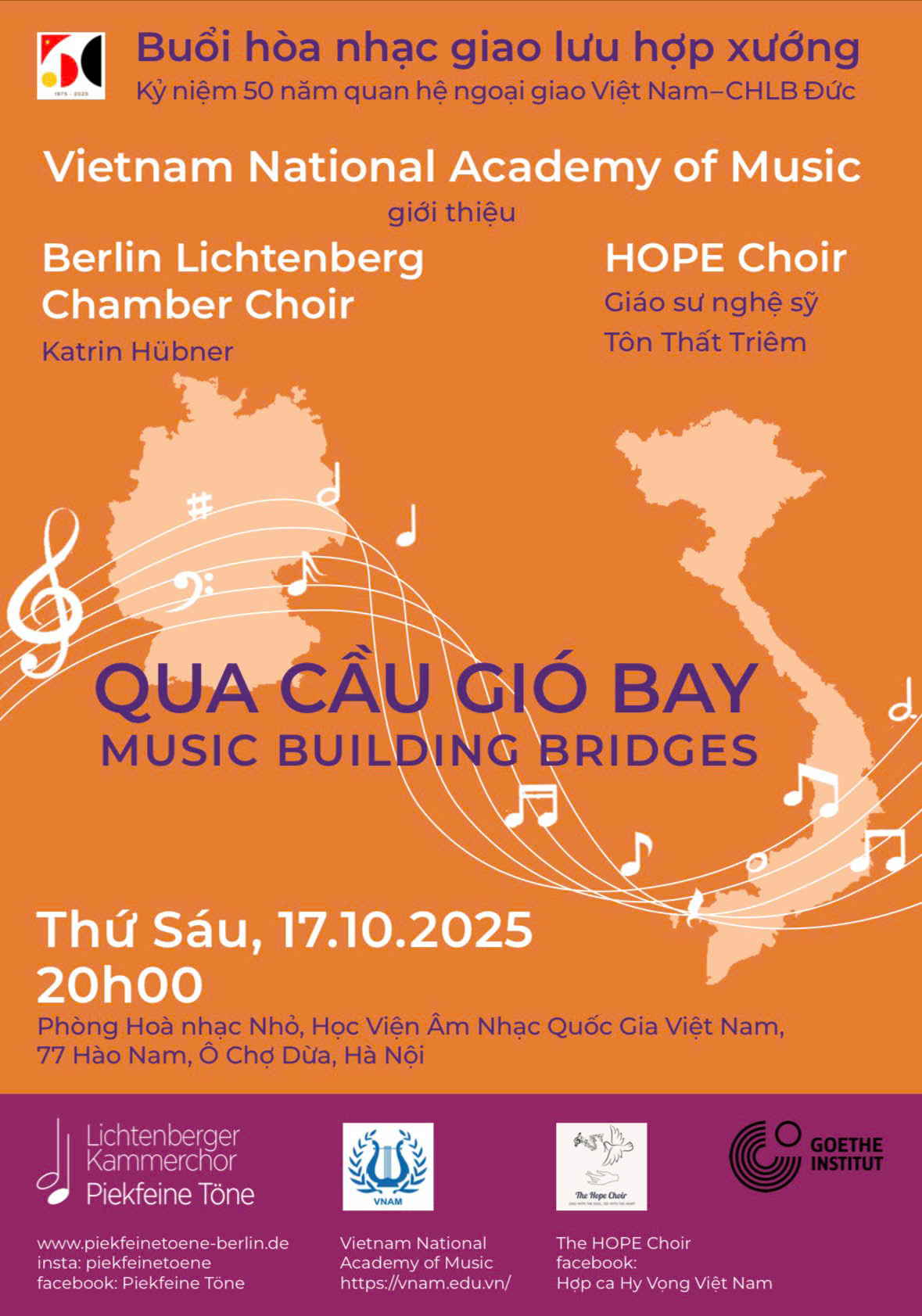 Kính mời các bạn đến dự buổi biểu diễn của Dàn hợp xướng Berlin Lichtenberg Chamber Choir (CHLB Đức) nhân kỷ niệm 50 năm quan hệ Ngoại giao Việt Nam - CHLB Đức. Buổi biểu diễn có sự tham gia của Dàn hợp xướng HOPE Choir (Việt Nam).